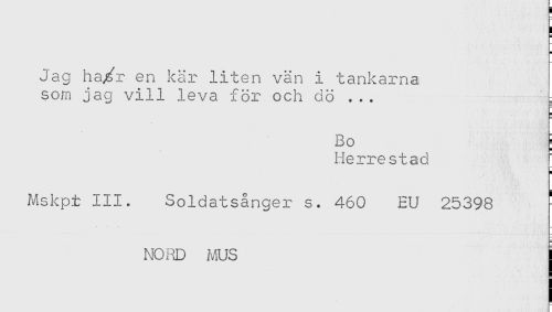 //// B //// Jag ha/r en kär liten vän i tankarna //// som jag vill leva för och dö ... 1 //// 5 //// Bo i //// i //// Herre stad ; //// Mskpt III. Soldatsånger s. 460 EU 25398 //// NORD MUS I ////