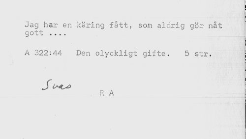 //// Jag har en käring fått. som aldrig gör nåt //// gott .... //// A 322:44 Den olyckligt gifte. 5 str. //// R A ////