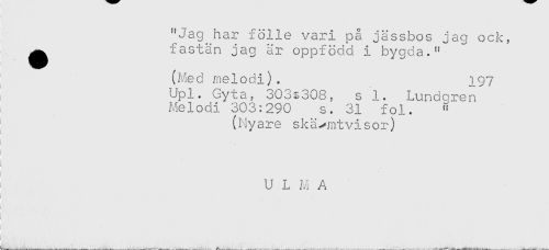 //// "Jag har folie vari på jässbos jag ock, //// ^ fastän jag är oppfödd i bygda." //// (Med melodi) . //// Upl. Gyta, 303$308, s 1. Lundaren //// Melodi 303:290 s. 31 fol. " //// (Ny are ska t vi s or) //// U L M A //// I //// ! //// t //// V.---^-______.__-. -. ....... ... -...V*-***"*- . _____-. . ____ -L._____ . ___Vv. . . . _____r- . ..'. . . ////