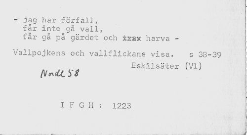 //// - jag har förfall, //// får inte gå vall, //// får gå på gärdet och trav harva - //// Vallpojkens och vallflickans visa. s 38-39 //// Eskilsäter (VI) //// I F G H : 1223 ////