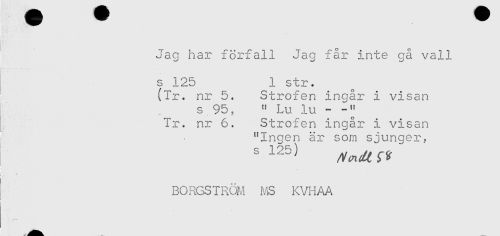 //// Jag har förfall Jag får inte gå vall //// I.. v.. ... . //// s 125 1 str. //// (ir. nr 5. Strofen ingår i visan //// . s 95, " Lu lu - //// Ir. nr 6. Strofen ingår i visan //// "Ingen är som sjunger, //// i //// BORGSTRÖM MS KVHAA ////