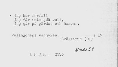//// - jag har förfall //// jag får inte g^å vall, //// jag går på gärdet och harvar. //// Vallhjonens vagavisa. s 19 //// Skållerud (Dl) //// I F G H : 2356 ////