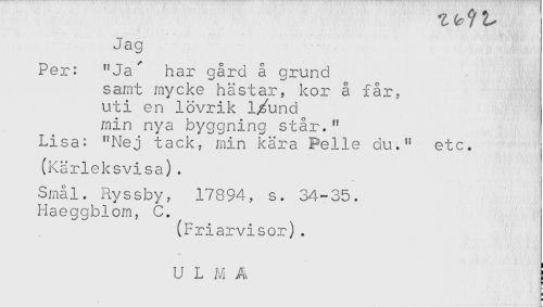 //// Y, ^ y //// Per: "Ja' har gård å grund //// samt mycke hästar, kor å får, //// uti en lövrik l/und //// min nya byggning står." //// Lisa: "Nej tack, min kära Pelle du." etc. //// (Kärleksvisa). //// Smål. Ryssby, 17894, s. 34-35. //// Haeggblom, C. //// (Friarvisor). ////