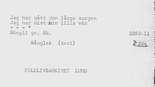 //// i //// < //// Jag har gått den långa sorgen //// Jag har mist änin lilla vän //// _ _ _ t! //// Skegli ge, Sk. 2283:11 //// Sånglek (text) //// B //// t //// FOLKLIVSARKIVET LUND ////