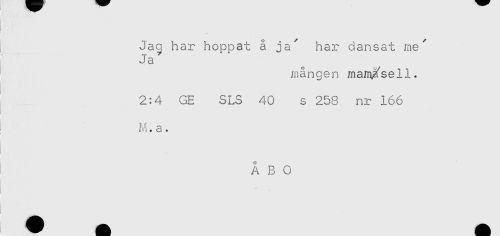 //// Jaq har hoppat å ja' har dansat me' //// Ja //// mången mam^sell. //// 2:4 GE SLS 40 s 258 nr 166 //// M. a. //// i //// ÅBO ////