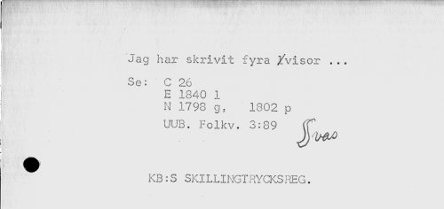 //// - //// . ' ' . . . * - ' . //// Jag har skrivit fyra /visor ... //// j<-' //// Se: C 26 //// E 1840 1 //// N 1798 g, 1802 p //// UUB. Folkv. 8:89 (f //// KB:S SKILLINGTRYCKSREG. ////