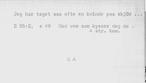 //// Jeg har taget saa ofte en kvinde paa skjöd ... //// B 55:2- s 49 Gud vem som kysser deg nu . //// 4 str. kom. //// R A //// : //// i //// i //// ' ////