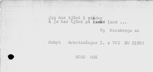 //// Jag har tjänt i stader //// å ja har tjänt på land ... //// j . //// ! //// Vg Korsberga sn //// Mskpt Arbetssånger I, s 783 EU 21953 //// ^ NORD iviUS ////