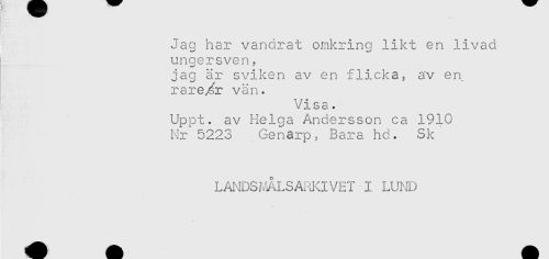 //// Jag har vandrat omkring likt en livad //// ungersven, //// jag är sviken av en flicka, äv en //// rare/^r vän. //// Visa. //// Uppt. av Helga Andersson ca 1910 //// Nr 5223 Genarp, Bara hd. Sk //// LANDSMÅLSARKIVET I LUND ////
