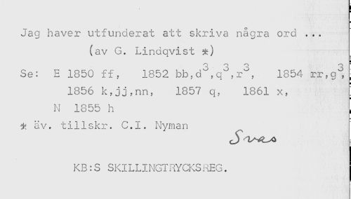 //// s //// Jag haver utfunderat att skriva några ord ... //// (av G. Lindqvist //// i //// Se: E 1850 ff, 1852 1854 rr,o^ , //// 1856 k,jj,nn, 1857 q, 1861 x, ' //// H //// N 1855 h i //// % Hv. tillskr. C.I. Nyman //// KB:S SKILLINGTRYCKSi-iEG. ////