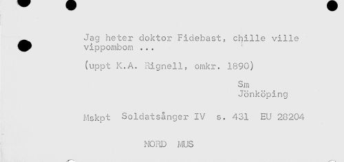 //// ^^ Jag heter doktor Fiaebast. chille ville //// ^^ vippombom ,.. //// (uppt K.A. Rignell? omkr. 1890) //// Sm //// Jönköping //// Mskpt Soldatsånger IV s. 431 EU 28204 //// NORD NUS ////