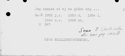 //// ! , - ' //// Jag hoppas ni ej ha glömt mig ... //// # Se:E 1852 j,r, 1853 d, 1854 1, //// 1864 d,v, 1869 hh, //// G 247 //// KB:S SKILLINGIRYCKSREG. ////