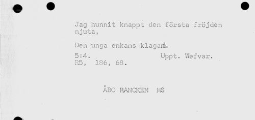//// Jag hunnit knappt den första fröjden //// njuta, //// Den unga enkans klagarä. //// 5:4. Uppt. Wefvar. //// R5, 186, 68. //// ÅBO RANCKEN MS ////