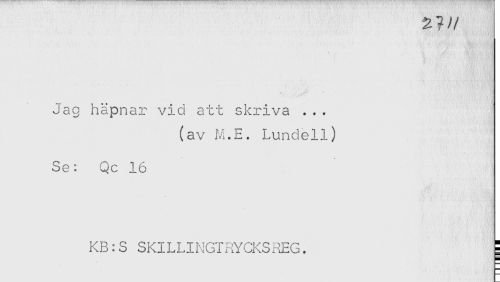 //// Jag häpnar vid att skriva ... //// (av M.E. Lundell) //// Se: Qc 16 //// KB: S SKILLINGIRYCKSr^EG. = ////