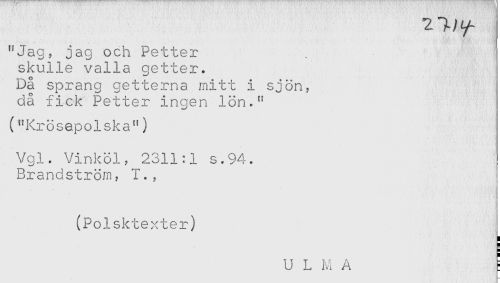 //// "Jag? jag och Petter //// skulle valla getter. //// Då sprang getterna mitt i sjön? //// då fick Petter ingen lön." //// ("Krösapolska") //// Vgl. Vinköl, 2311:1 s.94. //// Brandström, 1., //// (Polsktexter) //// U L M A ////