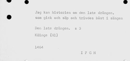 //// Jag kan historien om den late drängen, //// ^ som gick och söp och trivdes bäst i sängen //// Den late drängen. s 3 //// Köinge (Hl) //// 1464 //// I F G H ////