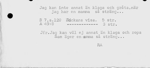 //// ' Jag kan inte annat än klaga och gråta?när //// ^ jag har en mamma så sträng... //// I B 7,s.l20 Hdckans visa. 5 str. //// A 49:8 --- 3 str. //// f //// Jfr. Jag kan val ej annat, an klaga och ropa //// Som äger en ramma så sträng... //// RA //// ' ////