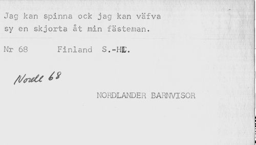 //// Jag kan spinna ock jag kan väfva //// sy en skjorta åt min fästeman. //// Nr 68 Finland S.-IHC. //// NORDLANDER BARNVISOR ////