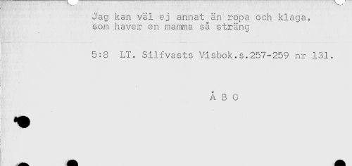 //// - * - * . //// Jag kan väl ej annat än ropa och klaga, //// som haver en mamma så sträng //// ' < ' / . ^ ^ . _ //// i //// 5:8 LT. Sil-fvasts Visbok.s.257-259 nr 131. //// < * //// i * *' , //// ! .' ' i ' //// ÅBO //// - //// ' ' //// i //// ! ////