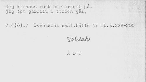 //// Jag kronans rock har dragit på, //// jag som gardist i staden går, //// 7:4(6).? Svenssons saml.häfte Nr 16.s.229-230 //// ÅBO ////
