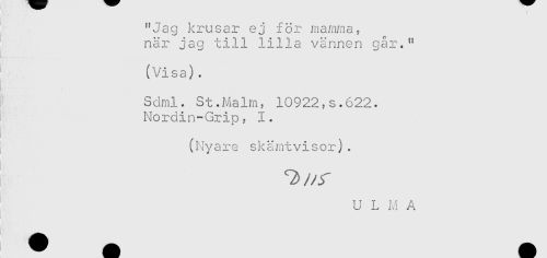 //// "Jag krusar ej för mamma? //// när jag till lilla vännen går." //// (Visa). //// : Sdml. St.Malm, 10922,s.622. //// Nordin-Grip, 1. //// (Nyare skämtvisor). //// U L M A //// ) ////