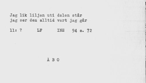 //// s //// Jag lik liljan uti dalen står //// jag ser den alltid vart jag går //// 11: ? LF INE 94 s. 72 //// ÅBO ////