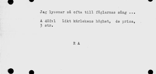 //// Jag lyssnar så ofta till fåglarnas sång ... //// A 402:1 Likt kärlekens höghet, de prisa, //// 3 str. //// R A ////