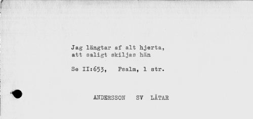//// t //// J //// Jag längtar af alt hjerta, //// att saligt skiljas hän //// Se 11:653, Psalm, 1 str. //// ^ ANDERSSON SV LÅTAR ////