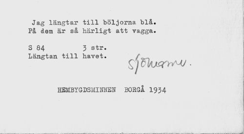//// Jag längtar till böljorna blå. //// På dem är så härligt att vagga. //// S 84 3 str. //// Längtan till havet. //// HEMBYGDSMINNEN BORGÅ 1934 //// j ////