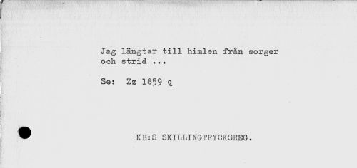 //// Jag längtar till himlen från sorger //// och strid ... //// Se: Zz 1859 q //// - //// ^ KB:S SKILLINGTRYCKSREG. ////