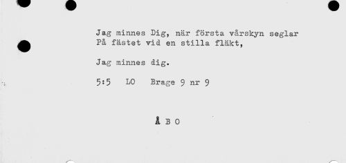 //// Jag minnes Dig, när första vårskyn seglar //// ^ Få fästet vid en stilla fläkt, //// Jag minnes dig. //// 5:5 LO Brage 9 nr 9 //// ÅBO ////
