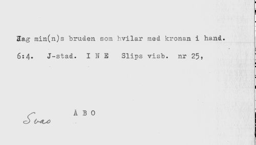 //// ! //// H //// i //// 3ag min(n)s bruden som bvilar med kronan i hand. //// * * //// 6:4. J-stad. I N E Slips visb. nr 25? //// i //// i //// ^ Å B 0 I ////