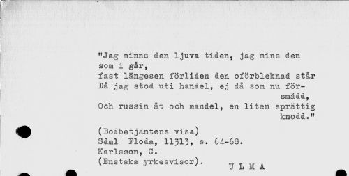 //// < //// ! //// "Jag minns den ljuva tiden, jag mins den //// som i går, //// fast längesen förliden den oförbleknad står //// Da jag stod uti handel, ej då som nu för- //// smådd, //// Och russin åt och mandel, en liten sprättig //// knodd." //// ^^^ (Bodbetjäntens visa) //// Sdml Flöda, 11313, s. 64-68. //// Karlsson, G. //// (Enstaka yrkesvisor). ,..,, ////