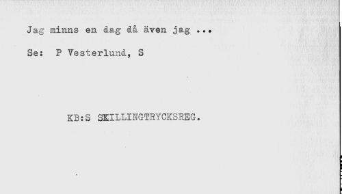 //// Jag minns en dag da även jag ... //// Se: P Vesterlund, S //// KB:S SKILLINGTRYCKSREG. ////