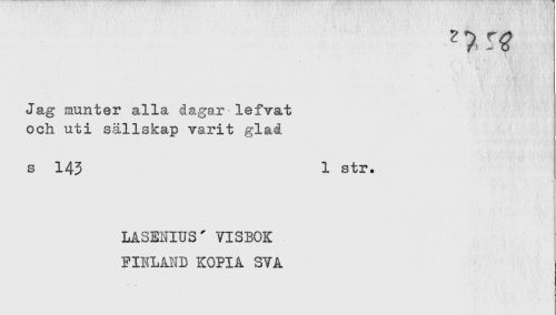 //// Jag munter alla dagar lefvat //// och uti sällskap varit glad //// s 143 1 str. //// LASENIUS" VISBOK //// FINLAND KOPIA SVA ////