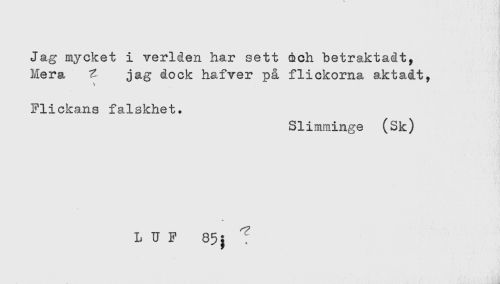 //// Jag mycket i verlden har sett och betraktadt. //// Mera ^ jag dock hafver på flickorna aktadt. //// Flickans falskhet. //// Slimminge (Sk) //// L U F 85^ ^ ////