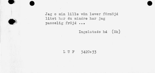 //// ) ! //// t //// Jag o min lille vän lever förnöjd //// ^^ litet har du mindre har jag //// passelig fröjd ... //// Ingelstads hd (Sk) //// L U F 3420:33 ////