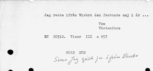 //// Jag reste ifrån Wisbro den femtonde maj i år ... //// Vsm //// Västanförs //// . //// EU 20310. Visor III s 857 //// ^ NORD MUS , ////