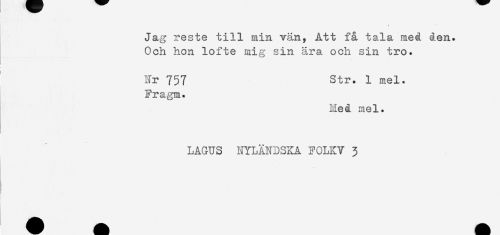 //// Jag reste till min vän, Att få tala med den. //// Och hon löfte mig sin ära och sin tro. //// ! //// Nr 757 str. 1 mel. //// Fragm. //// Hed mel. //// LAGUS NYLANDSKA FOLKV 3 ////