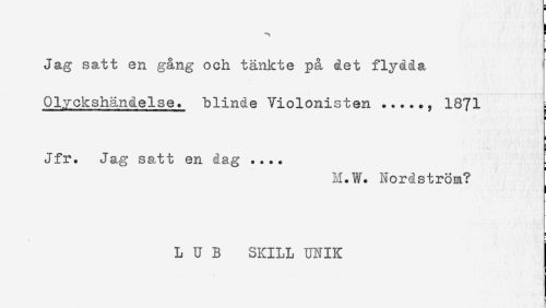 //// ] //// ^ ' //// Jag satt en gång och tänkte på det flydda //// Olyckshändelse, blinde Violonisten ....*, 1871 //// Jfr. Jag satt en dag .... //// M.W. Nordström? //// L U B SKILL UNIK ////