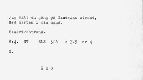 //// Jag satt en gång på Sandviks strand. //// Med harpan i min hand. //// Sandviksstrand. //// 8:4. ST SLS 328 s 3-5 nr 4 //// N. //// ' ] ////