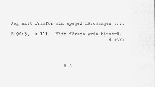 //// Jag satt framför min spegel häromdagen .... //// B 98:3? s 111 Mitt första gråa hårstrå. //// 4 str. //// R A ////