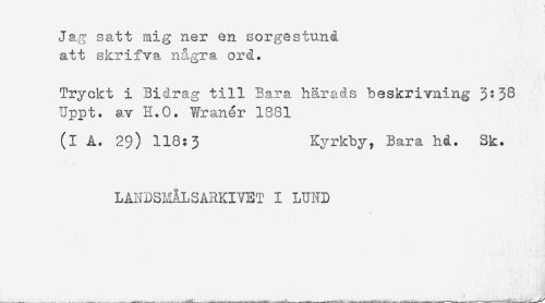 //// Jag satt mig ner en sorgestund //// att skrifva. några ord. //// Tryckt i Bidrag till Bara härads beskrivning 3^38 //// Uppt. av H.O. Wranér 1881 //// (I A. 29) 118:3 Kyrkby, Bara hd. Sk. //// LAl-msmLLSARKIVET I LUND ////