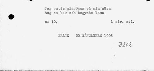 //// Jag satte glasögon på min näsa //// ^^ tog en bok och begynte läsa //// nr 10. 1 str. mel. //// BRAGE 20 SÅNGLEKAR 1908 ////