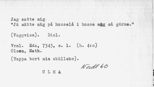//// Jag satte mig //// "Jä sätte mäg på husselå i husse mgg så gärne." //// (Vaggvisa). Di al. //// Vrml. Eåay 7343? s. 1. (h. 4:0) //// Olsen^ Math. //// (Tappa bort min skälleko). //// U L M A j //// f= //// f ////