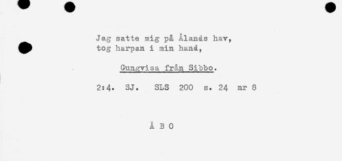 //// Jag satte mig på Ålands hav, //// ^^ tog harpan i min hand, //// Gum?visa frå,n Sibbo. //// 2:4. SJ. SLS 200 s. 24 nr 8 ////