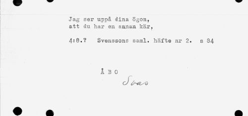 //// Jag ser uppå åina ögon, //// att du har en annan kär, //// 4:8.? Svenssons saml. häfte nr 2. s 84 //// . //// ÅBO ////