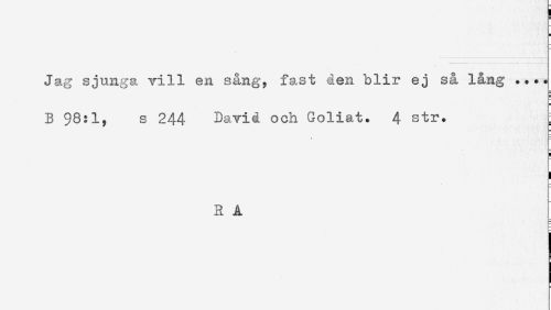 //// Jag sjunga vill en sång, fast den blir ej så lång .... //// B 98:1, s 244 David och Goliat. 4 str. ; //// ! //// R A ////
