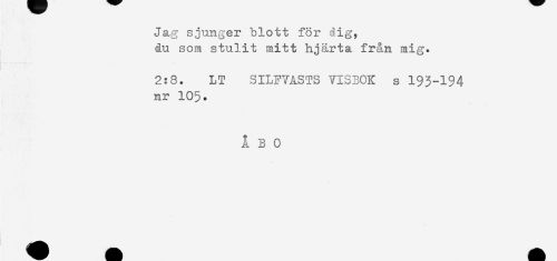 //// Jag sjunger blott för dig, //// du som stulit mitt hjärta från mig. //// 2:8. LT SILFYASTS VISBOK s 193-194 //// nr 105. //// ÅBO ////