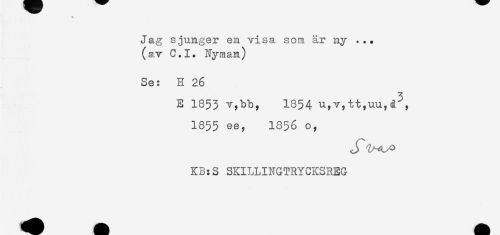 //// Jag sjunger en visa som är ny ... //// (av C.I. Nyman) //// Se: H 26 //// E 1853 v,bb, 1854 u,v,tt,uu,d^, //// 1855 ee, 1856 o, //// KB:S SKILLINGTRYCKSREG ////